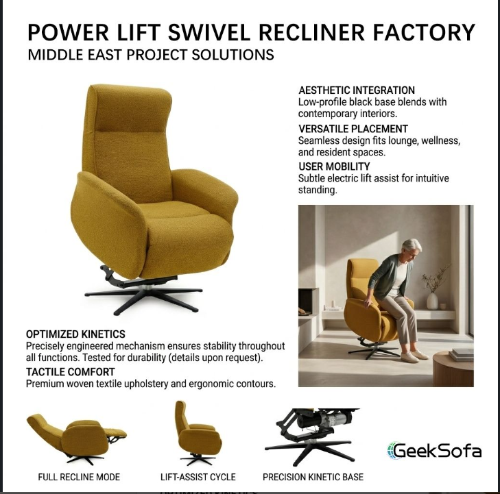 GeekSofa’s slim-profile Power Lift Swivel Recliner is built for this specific integration.
